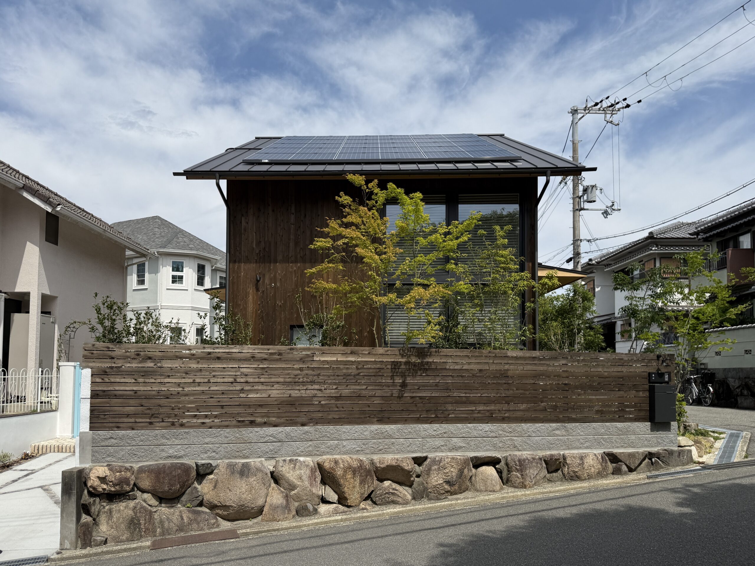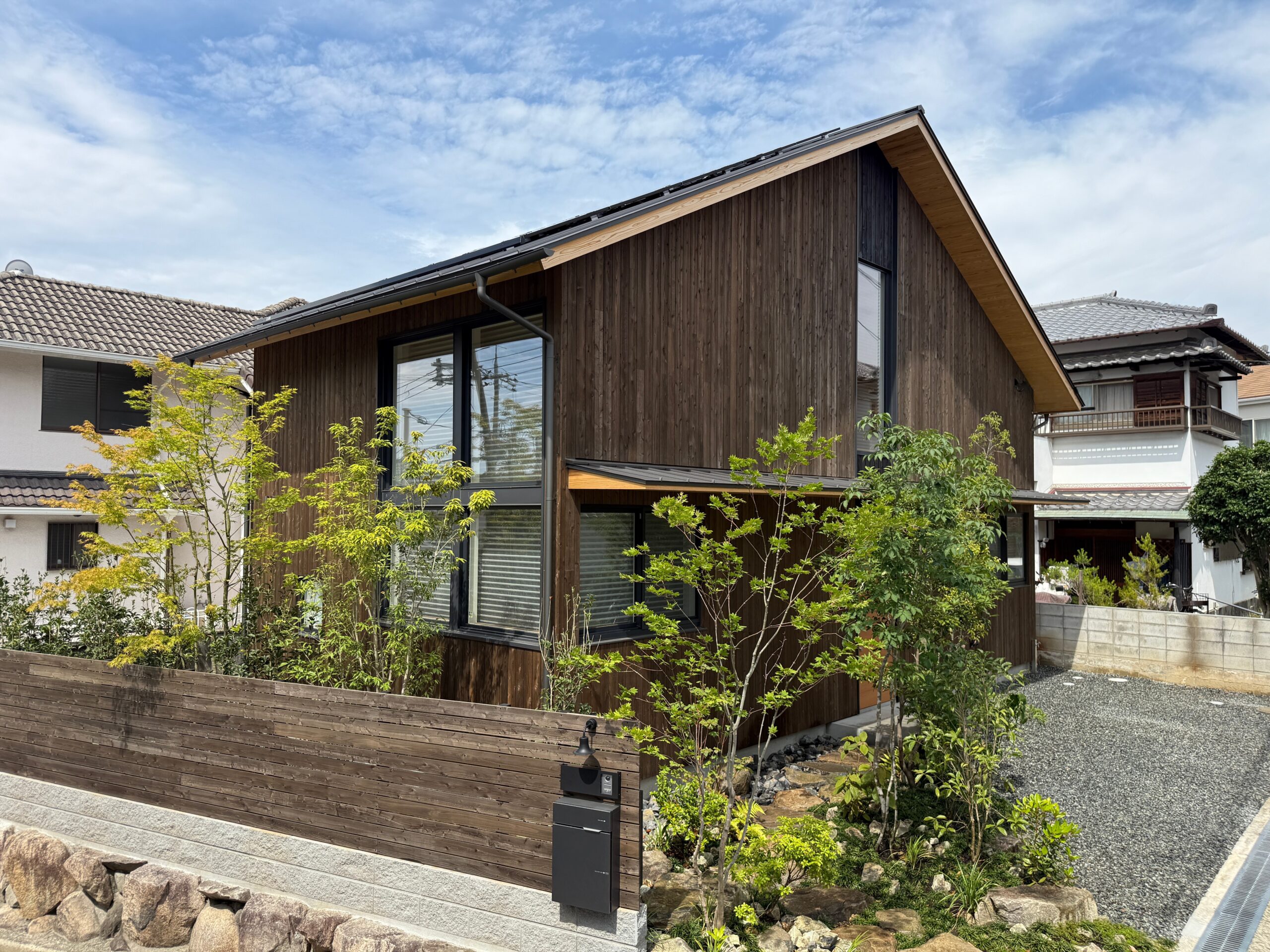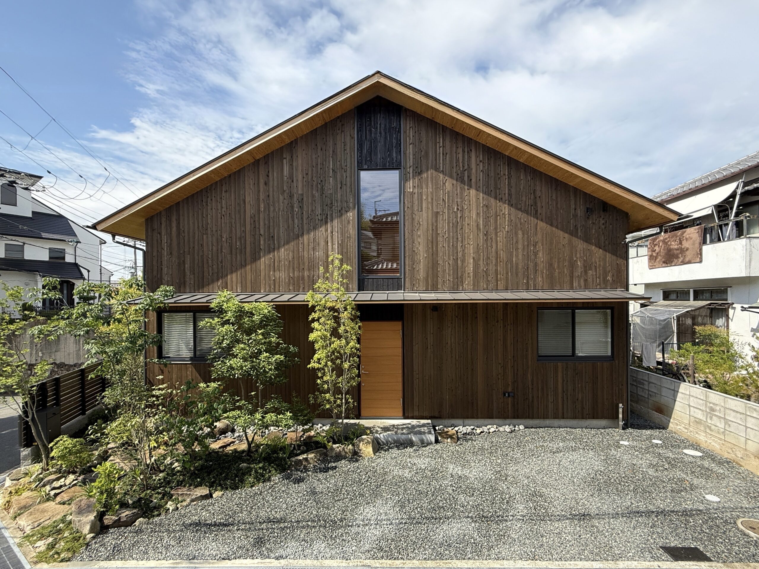 都市の喧騒から少し離れた住宅街の角地に建つ、凛とした木の家。風致地区・角地・壁面後退など法規制が重なる敷地で、UA値0.34W/㎡K、Q値1.01W/㎡K、C値0.16㎠/㎡を実現し、断熱等性能等級6、Q1.0住宅Level-3を達成した。端正な切妻屋根と屋久島地杉の外壁は、風景に溶け込みながらも静かな存在感を放つ。庭は室内とつながるもう1つの居場所として、季節の移ろいや光と影の変化を住まいにもたらしている。ファサードはシンメトリーと切妻屋根で端正にまとめ、景観に調和させた。見る方向で表情が変わる構成と植栽計画により、街に開かれた風景をつくり出し、静かで誠実な住まいを実現した。
