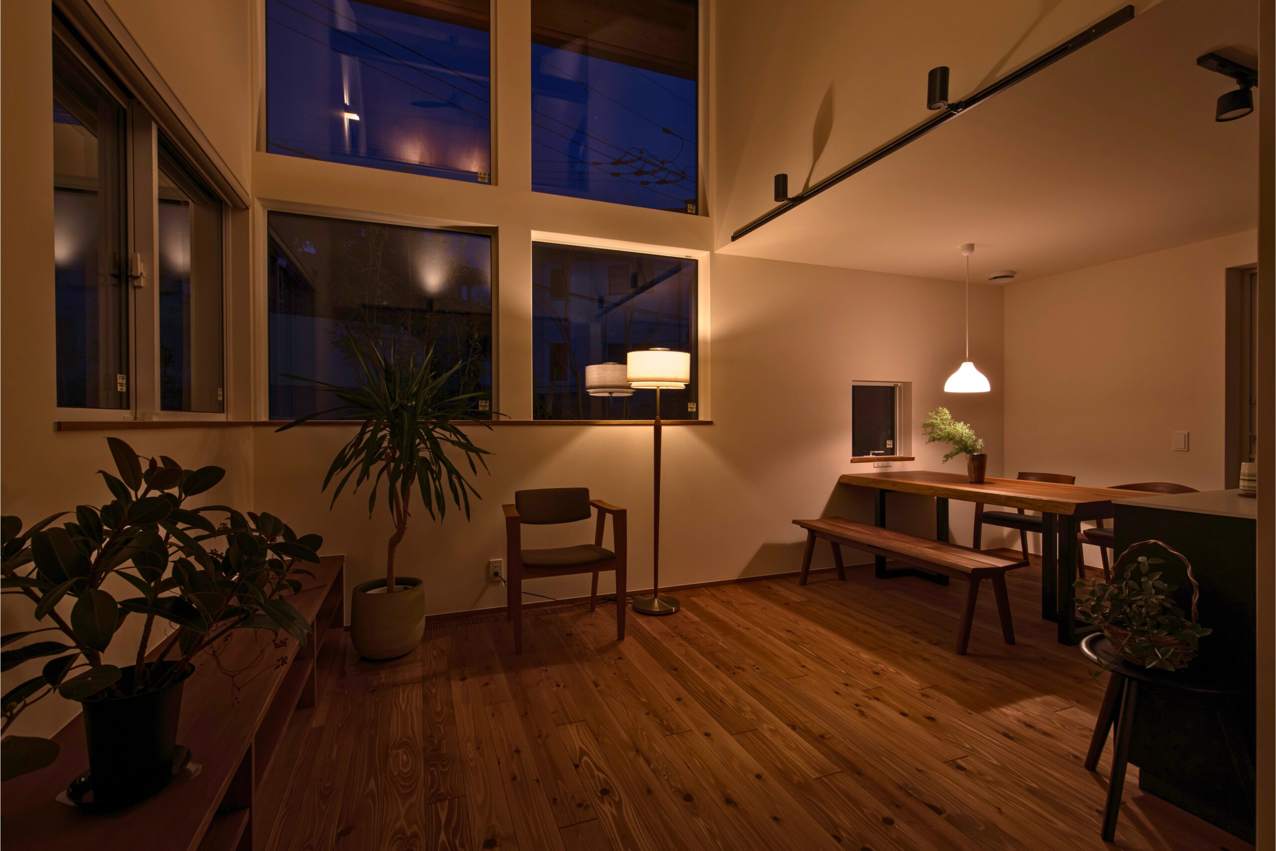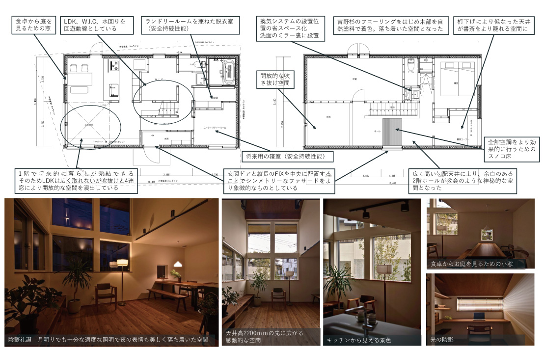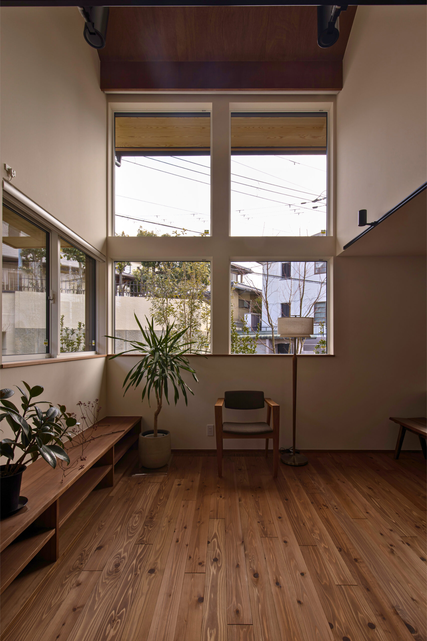 都市の喧騒から少し離れた住宅街の角地に建つ、凛とした木の家。風致地区・角地・壁面後退など法規制が重なる敷地で、UA値0.34W/㎡K、Q値1.01W/㎡K、C値0.16㎠/㎡を実現し、断熱等性能等級6、Q1.0住宅Level-3を達成した。端正な切妻屋根と屋久島地杉の外壁は、風景に溶け込みながらも静かな存在感を放つ。庭は室内とつながるもう1つの居場所として、季節の移ろいや光と影の変化を住まいにもたらしている。ファサードはシンメトリーと切妻屋根で端正にまとめ、景観に調和させた。見る方向で表情が変わる構成と植栽計画により、街に開かれた風景をつくり出し、静かで誠実な住まいを実現した。